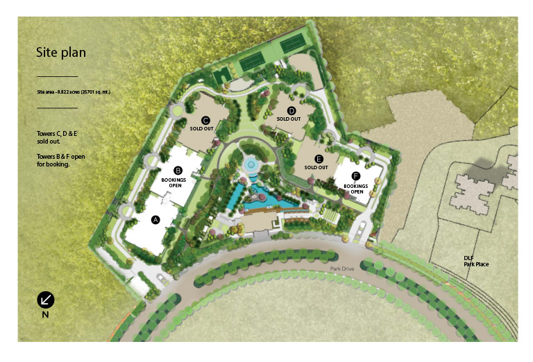 Spread across 8.82 acres, DLF The Crest features six architecturally elegant high-rise towers set amidst beautifully landscaped, resort-style gardens. The project offers premium 3 and 4 BHK residences, thoughtfully designed to provide privacy, low-density living, and a tranquil lifestyle within the city.